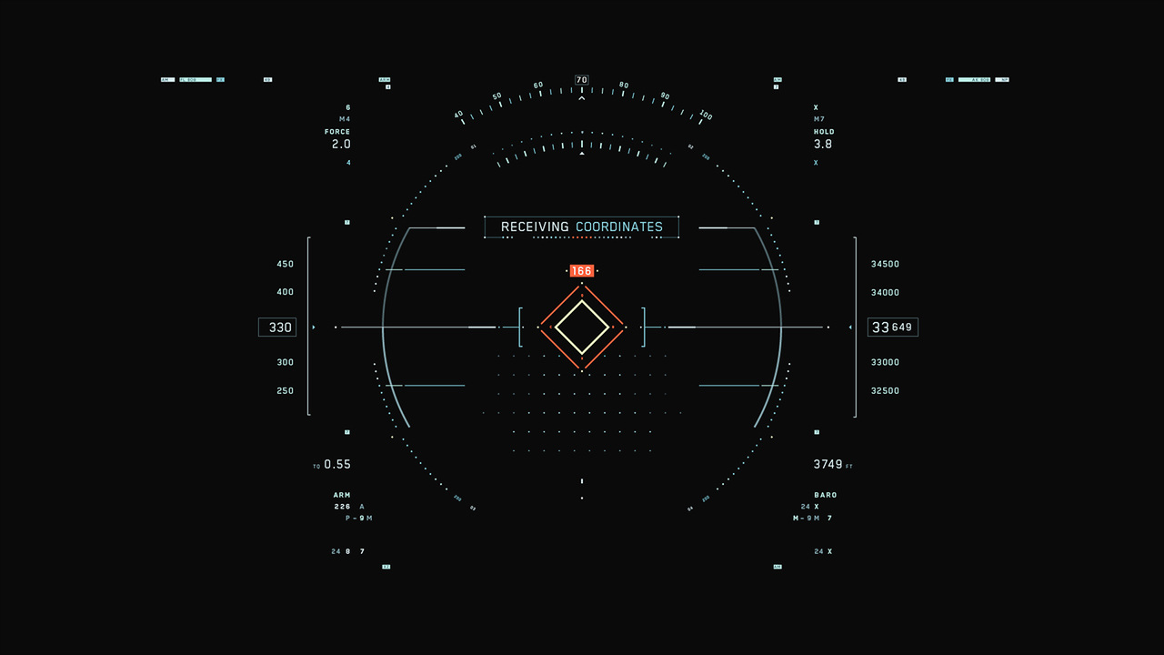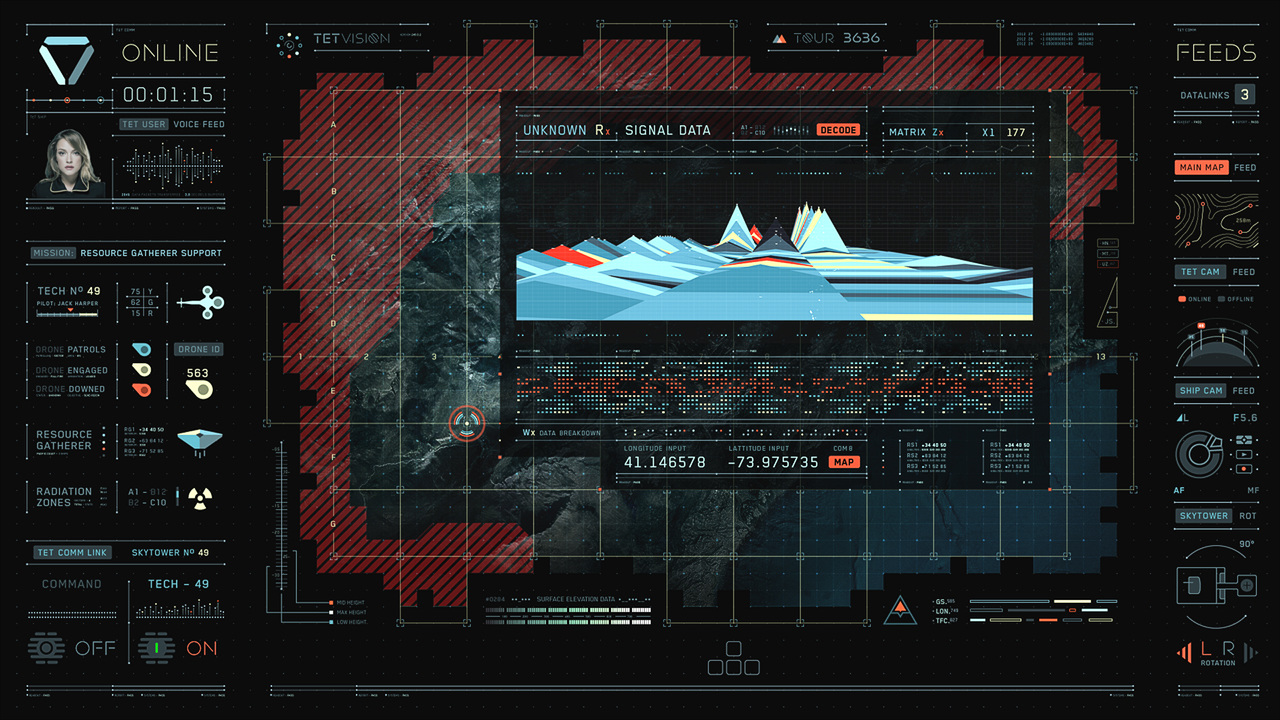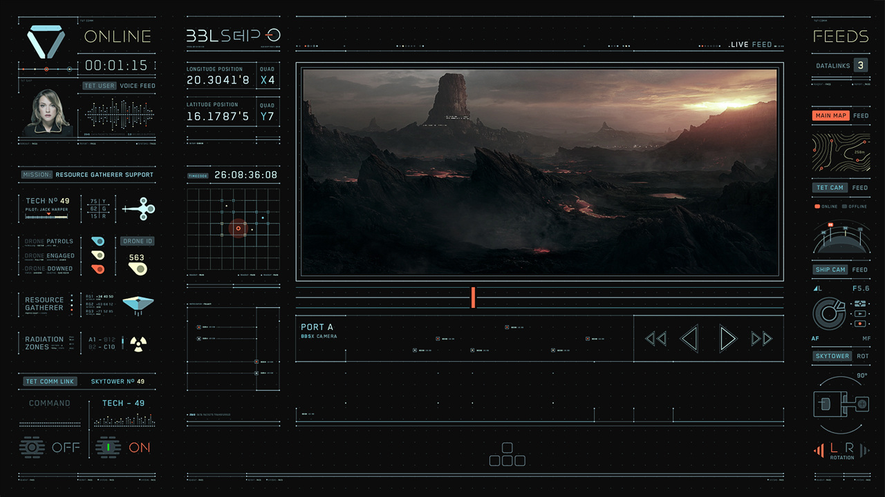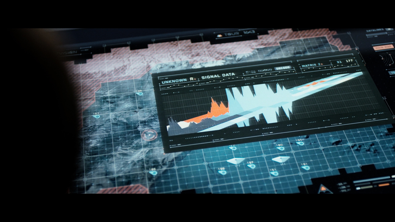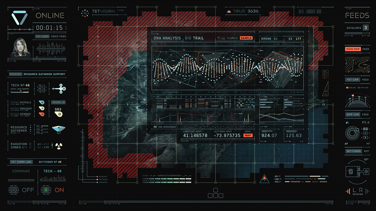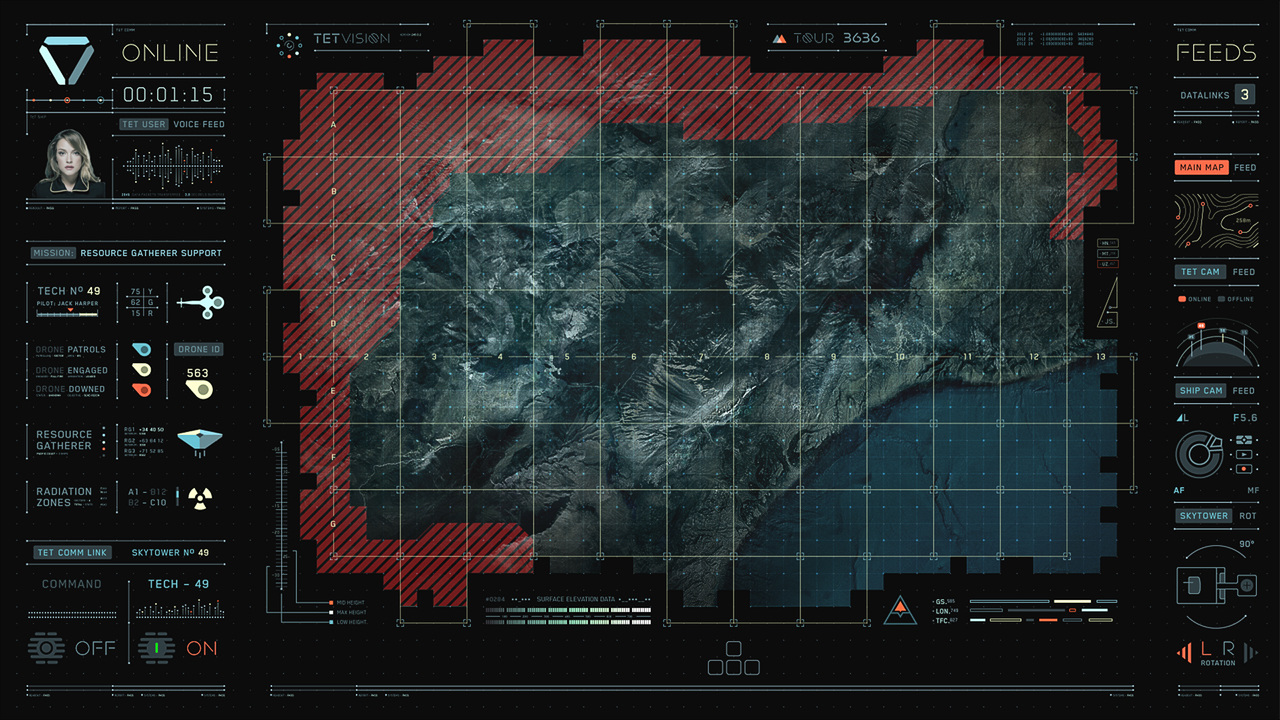 Jack's helicopter, a remarkable Daniel Simon creation called the Bubbleship, was Jack's paramount vehicle in the film… The UI appeared as a hologram embedded within the spherical glass cockpit, done to perfection by the lovely folks at Pixomondo, and functioned to assist Jack in his flight and combat duties throughout the film… The team researched a grip of Flight simulator and Helicopter Combat interfaces and sought to modernize the aesthetic while still delivering key functionality that would mimic real-world flight tools... And of course the team didn't want to fuck up Simon's baby with ugly UI, the German wrath was implanted deep within and ultimately, the Bubbleship UI was by far the most researched and pampered graphic task...