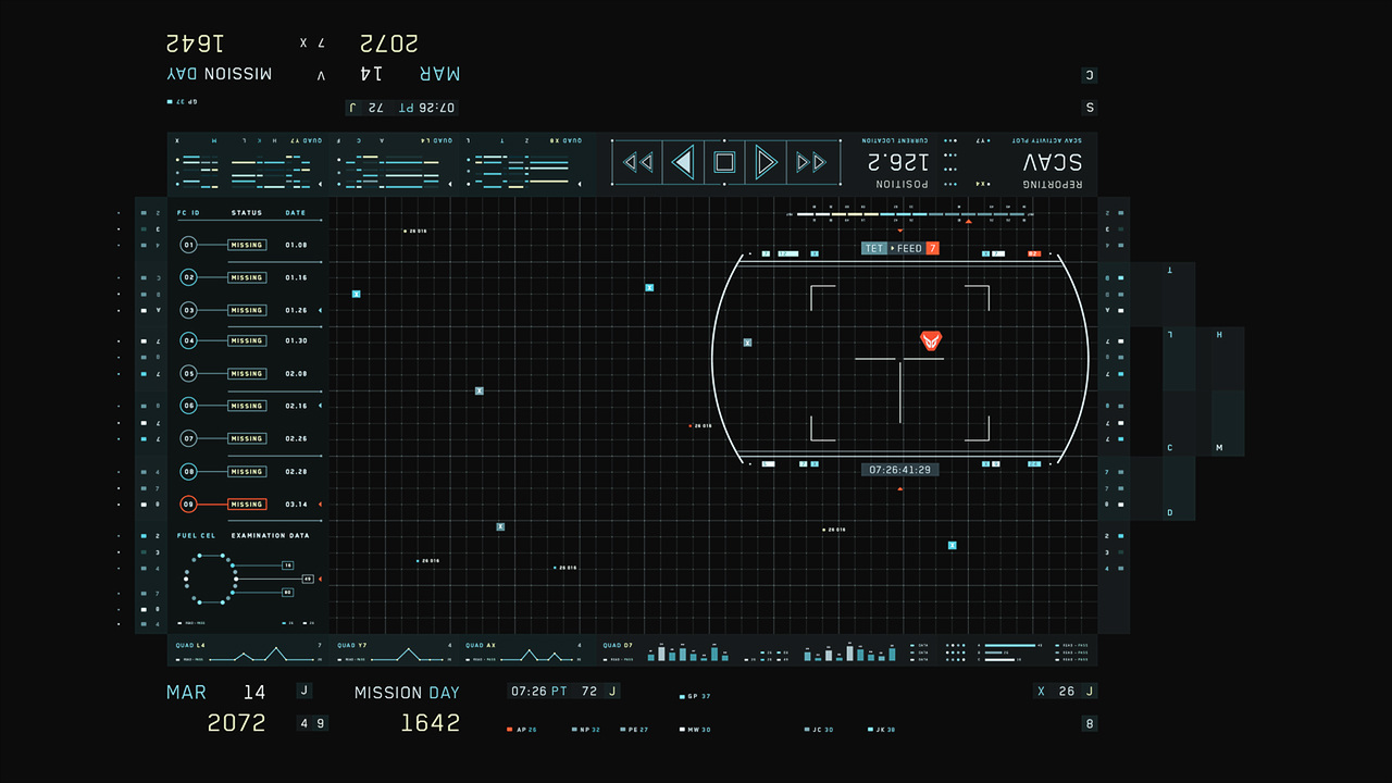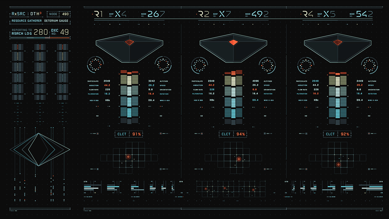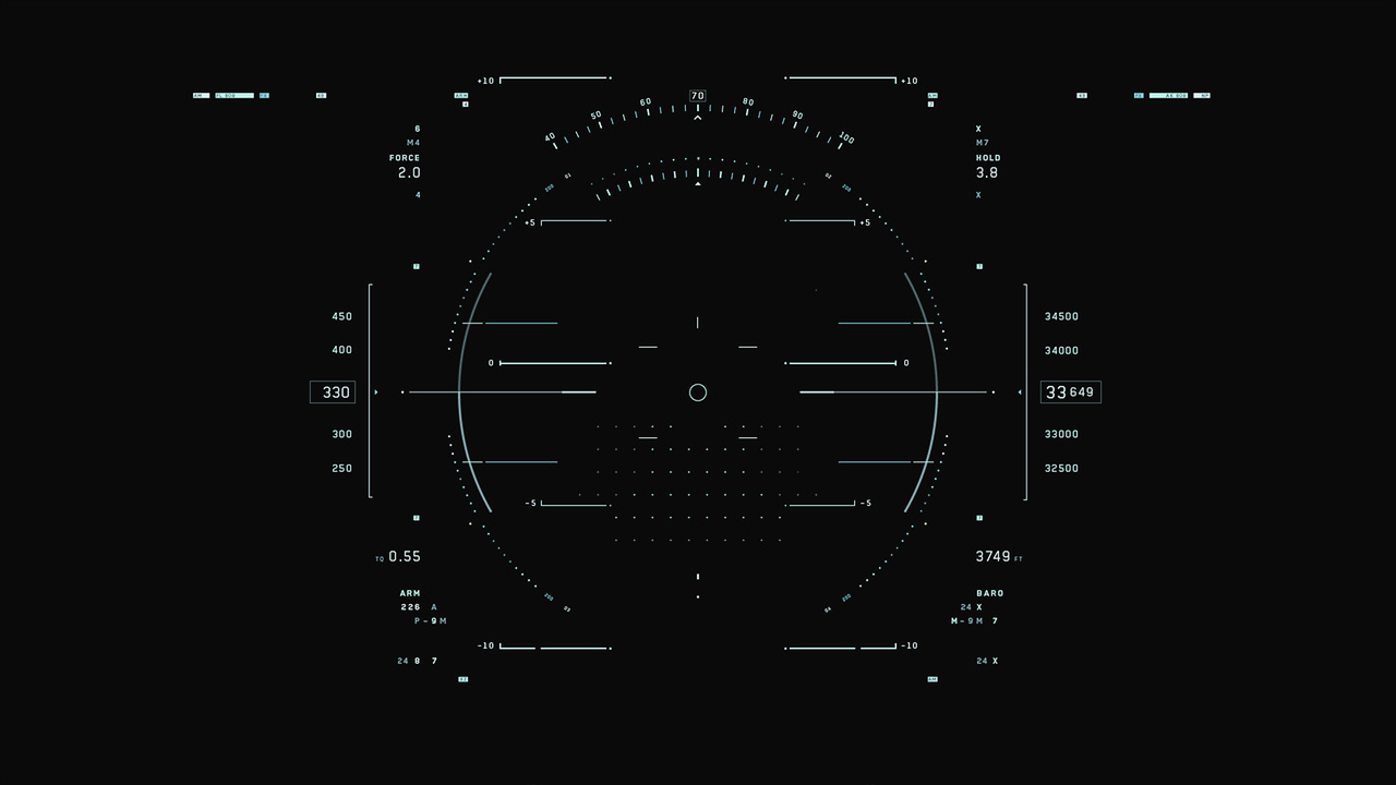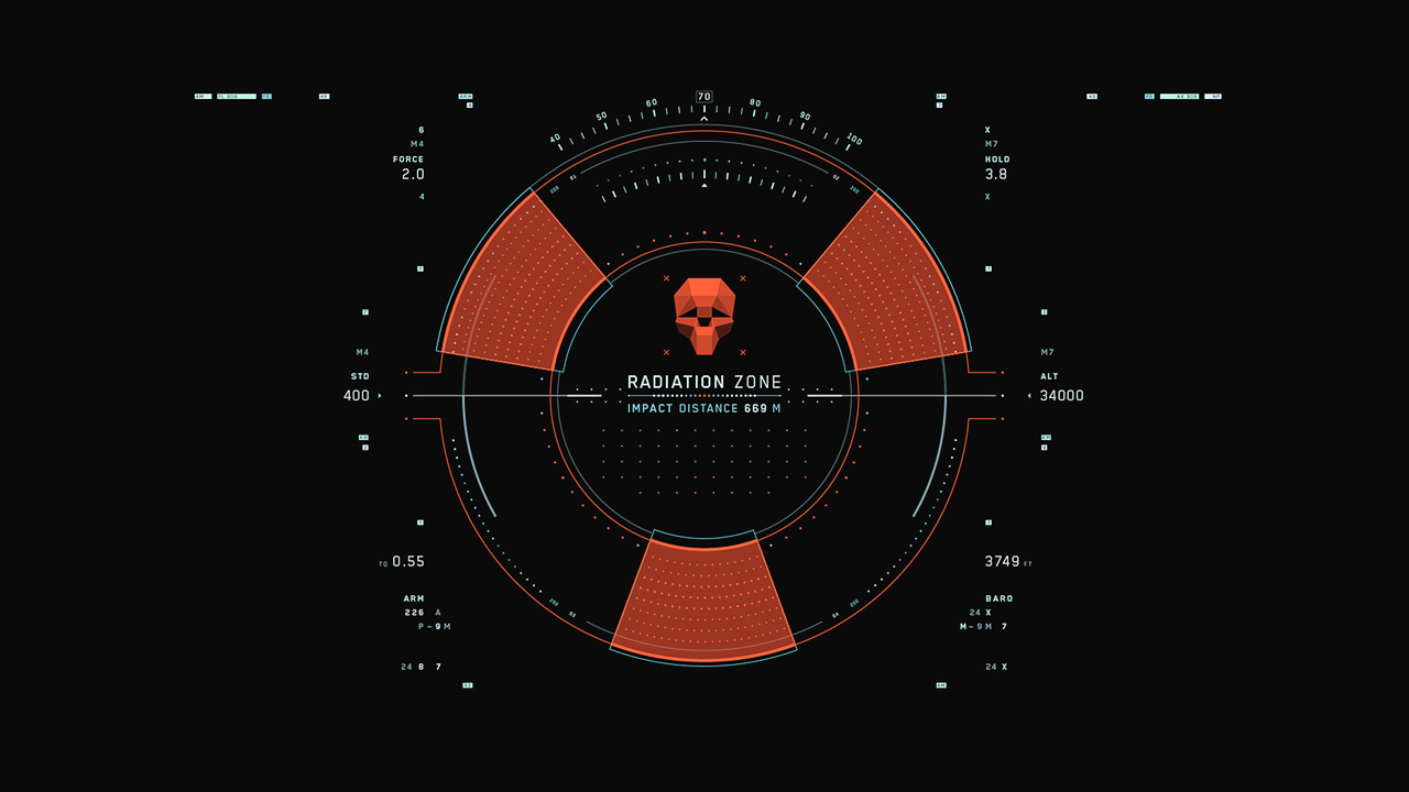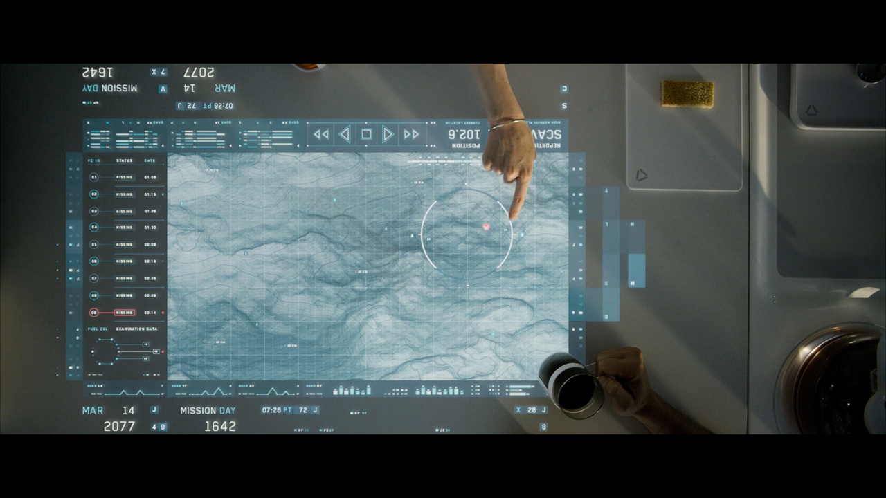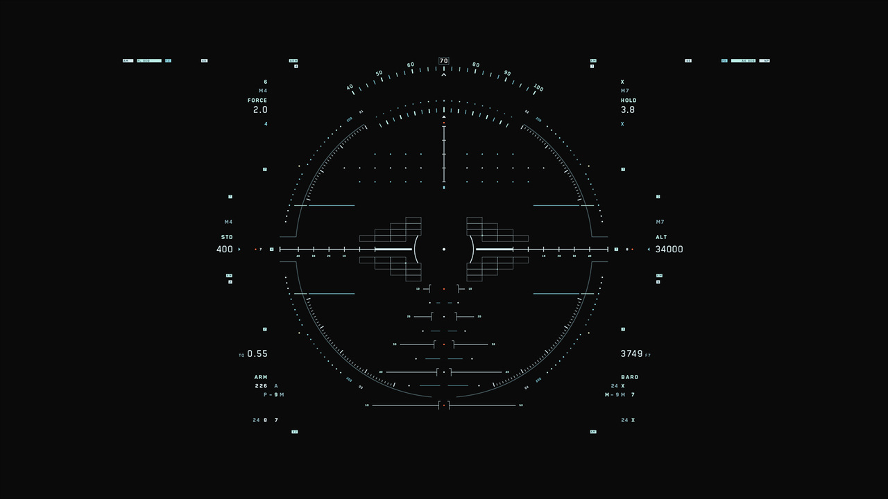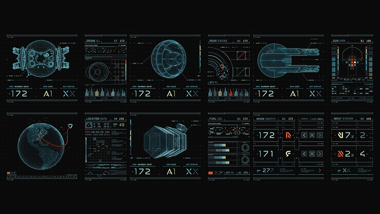 Jack's helicopter, a remarkable Daniel Simon creation called the Bubbleship, was Jack's paramount vehicle in the film… The UI appeared as a hologram embedded within the spherical glass cockpit, done to perfection by the lovely folks at Pixomondo, and functioned to assist Jack in his flight and combat duties throughout the film… The team researched a grip of Flight simulator and Helicopter Combat interfaces and sought to modernize the aesthetic while still delivering key functionality that would mimic real-world flight tools... And of course the team didn't want to fuck up Simon's baby with ugly UI, the German wrath was implanted deep within and ultimately, the Bubbleship UI was by far the most researched and pampered graphic task...