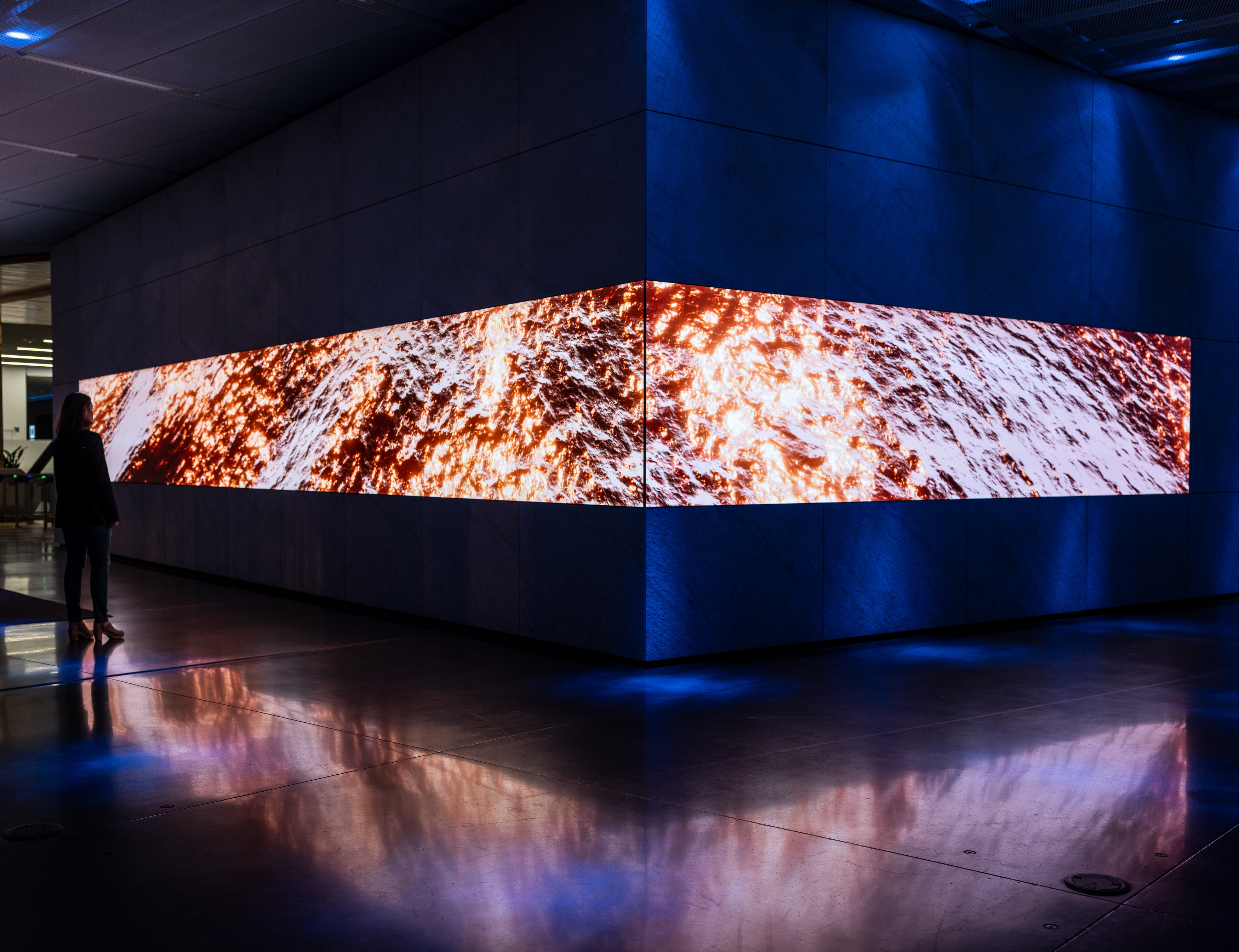 –– 02Leveraging real-time programming, audio-reactive 3D visuals, and immersive Dolby Atmos mixing, celestial bodies move through space while exoplanetary terrain is projected onto the gallery’s LED Ribbon Wall. With Dolby Atmos, sound is not constrained to channels, but moves around you in the three-dimensional space. The Dolby sound system allows users to pan around with their smartphones and be surrounded by sound throughout the gallery, creating a multi-immersive futuristic space adventure, supported by visuals inspired by scientific research and data. Munky and Unity Artist, Jeff Bryant, worked together to design the story and visuals behind the three planets in the installation, envisioning the project by looking towards the future of space travel.