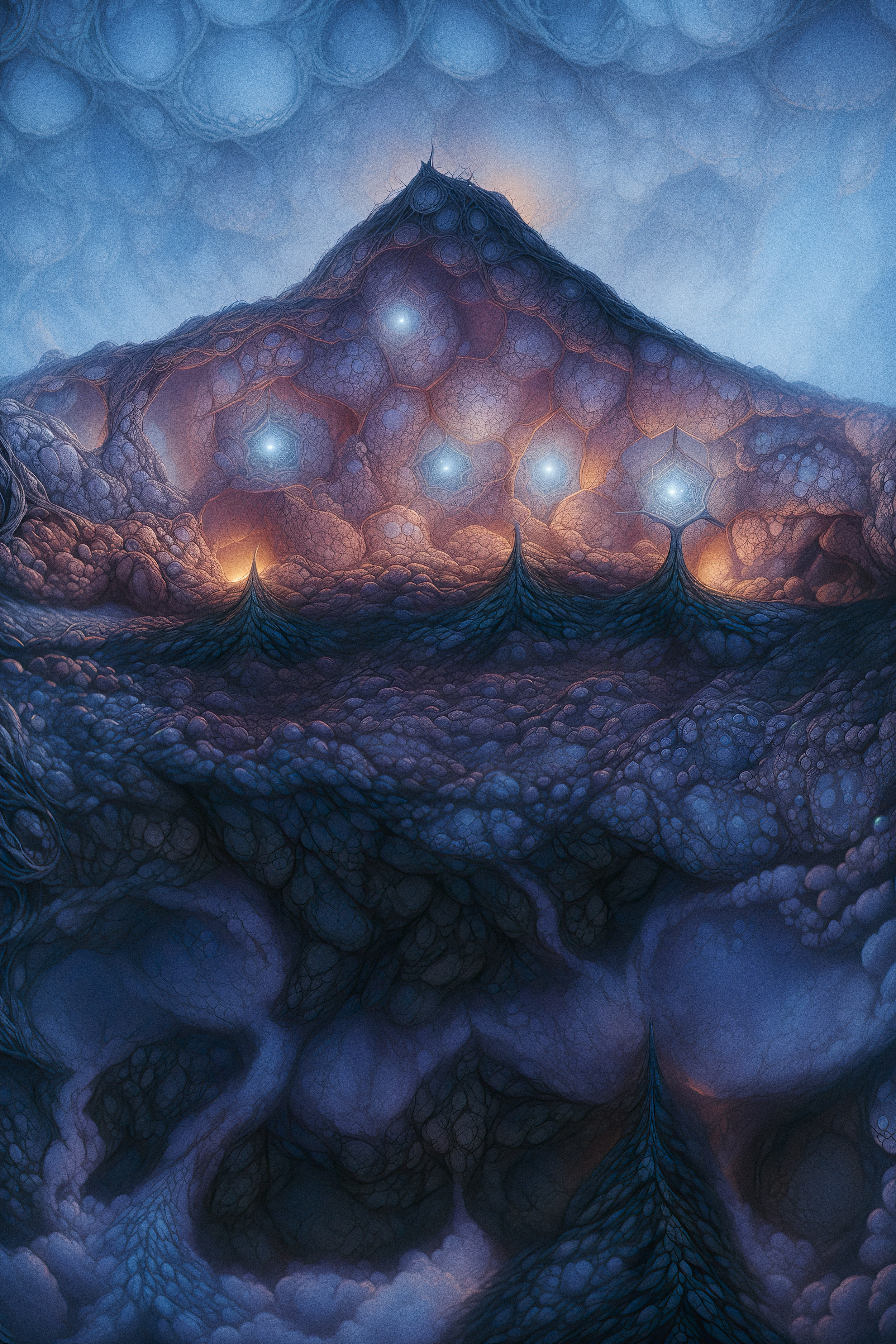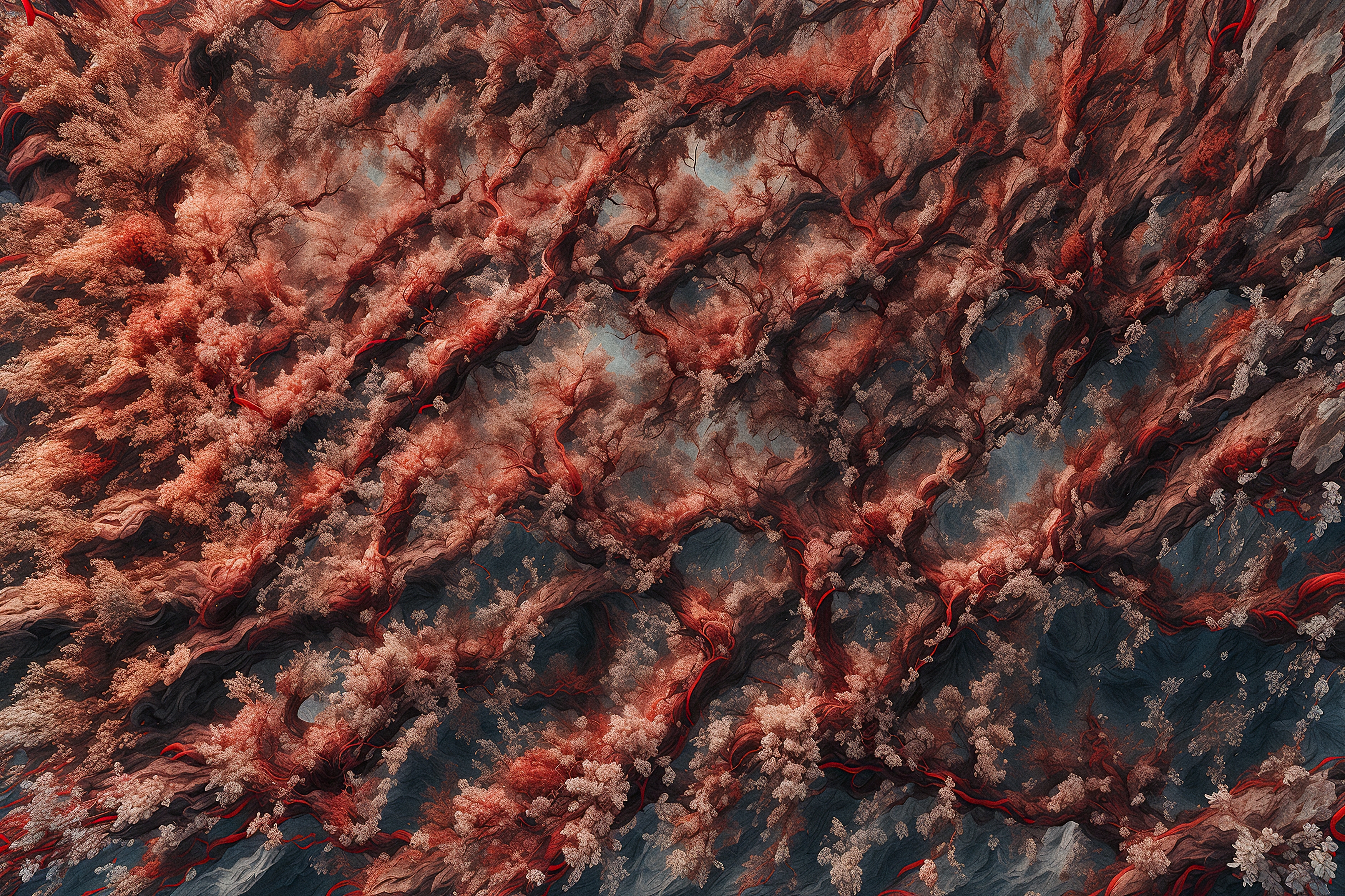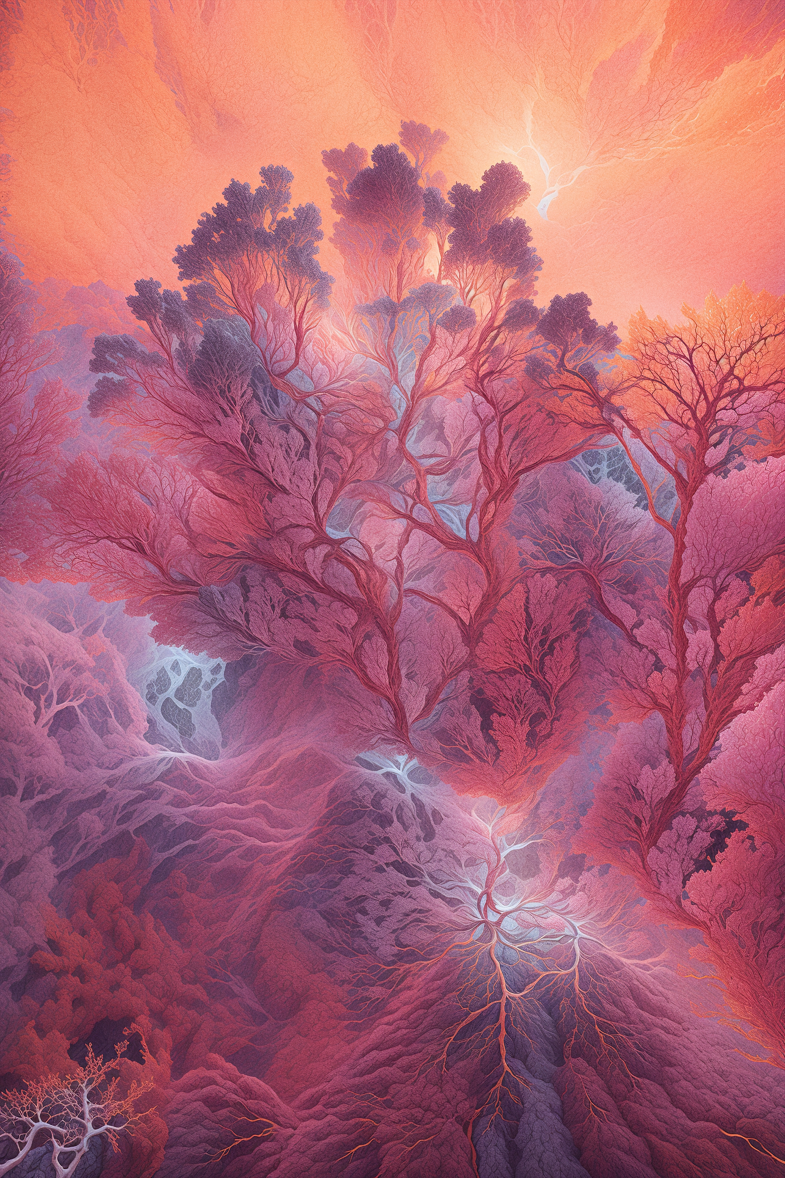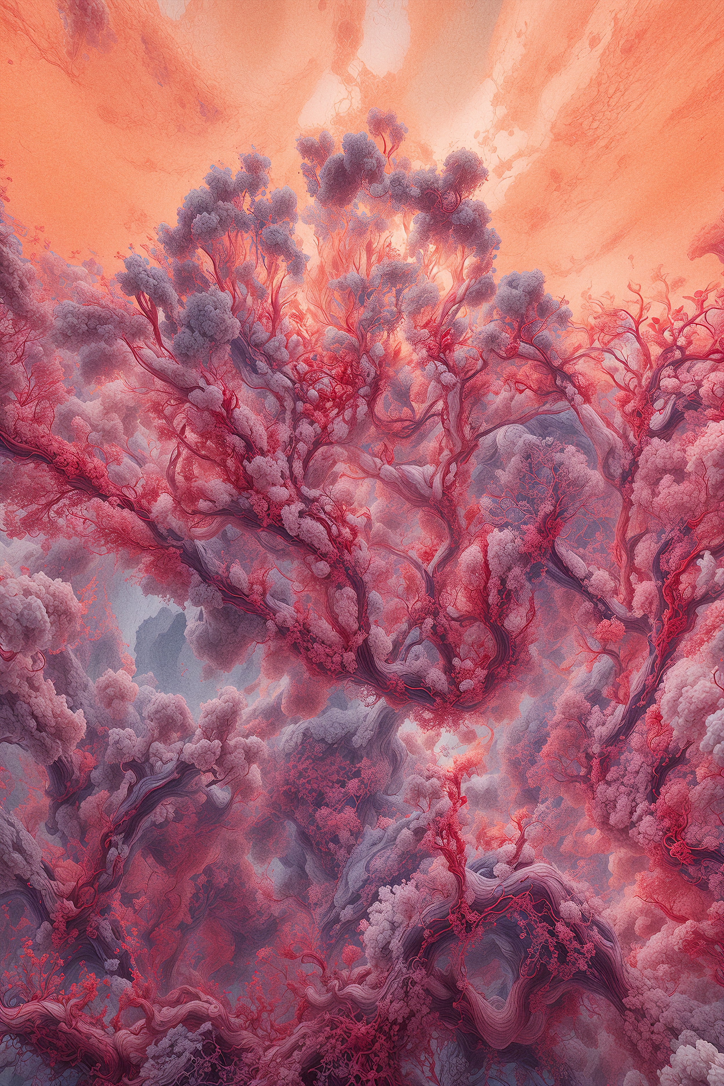 Using complex algorithms, these captures were transformed into surrealist mutations, extensions of nature’s raw pulse unfolding into new and improbable forms. Pixels became cellular units, subdividing and multiplying through a process akin to digital mitosis, guided by the breathing technique. The resulting compositions echo the vitality of living ecosystems while mirroring the gradual awakening of perception itself. This work operates as both transfiguration and meditation, a digital microcellular bloom shaped by machine intelligence and the intuitive spirit of the natural world. In this way, the project moves beyond documentation toward communion, articulating an evolving dialogue between the organic and the synthetic, and revealing the luminous structures that underlie life itself.