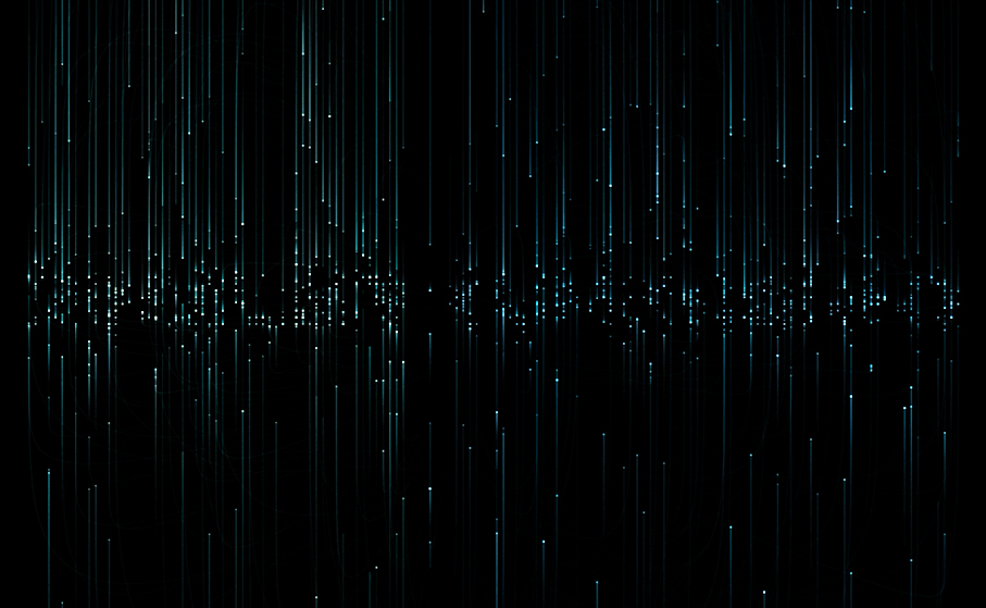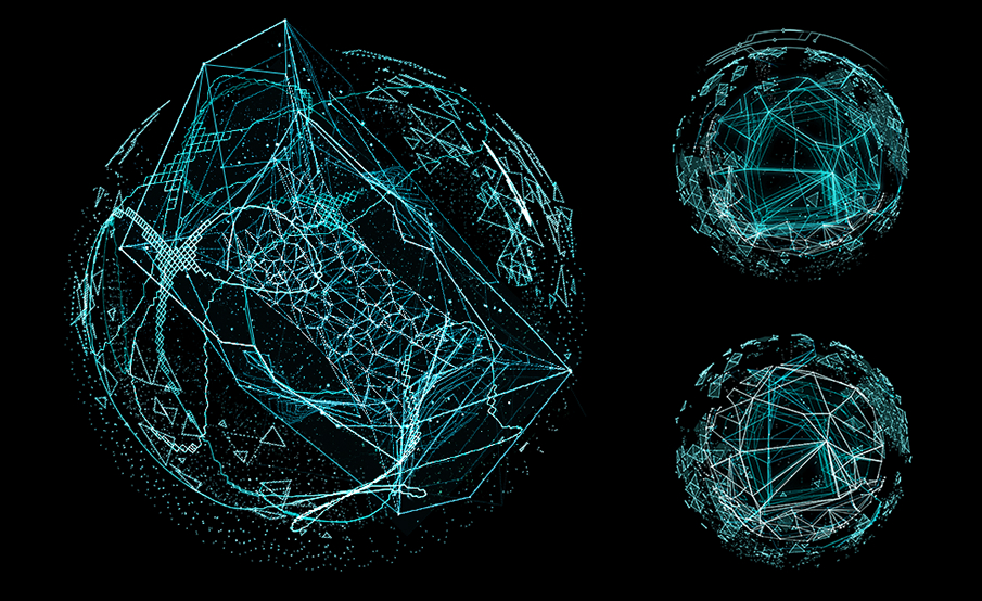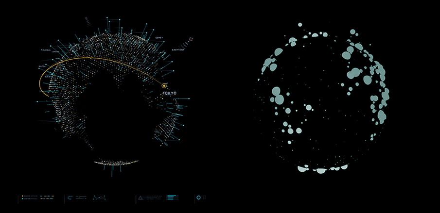 The initial design execution of the globe was accomplished through an open frameworks application developed by Nimoy and the team, which was then ported to Houdini by master Andy King and output with production quality DoF and motion blur. Munkowitz stylized and design directed all aspects of the output, although the final product was greatly simplified by the upper echelons to ensure a quick read, as supposedly too many awesomely detailed data storms make things confusing.