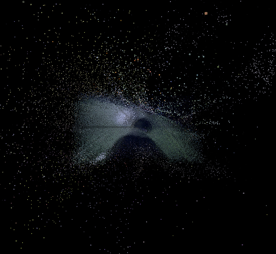 The team also utilized the Nimoy apps 'Beam-Pusher' and 'Twist' to generate a dense blanket of data points and linework traveling in an orbiting motion around Flynn's base. Although none of these assets were used in the final film, the team thought they were pretty fresh.