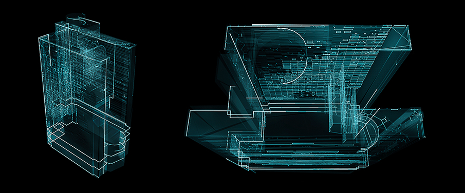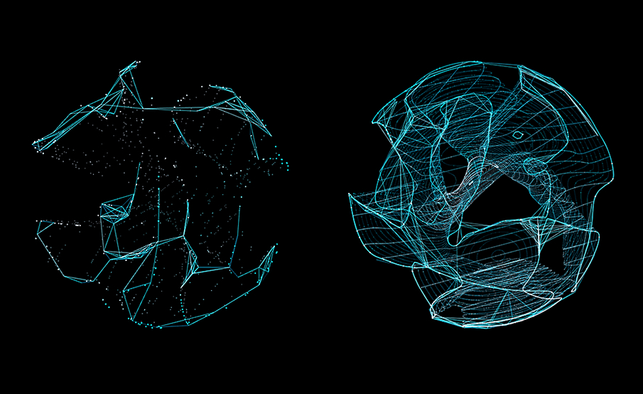 The team built an open-frameworks application with Mr. Josh Nimoy that would load OBJ data, allowing the team to define the 3d structure from the outset and then enhance the base shape with a generation-based network of fireworks streamers and subsequent expansion.