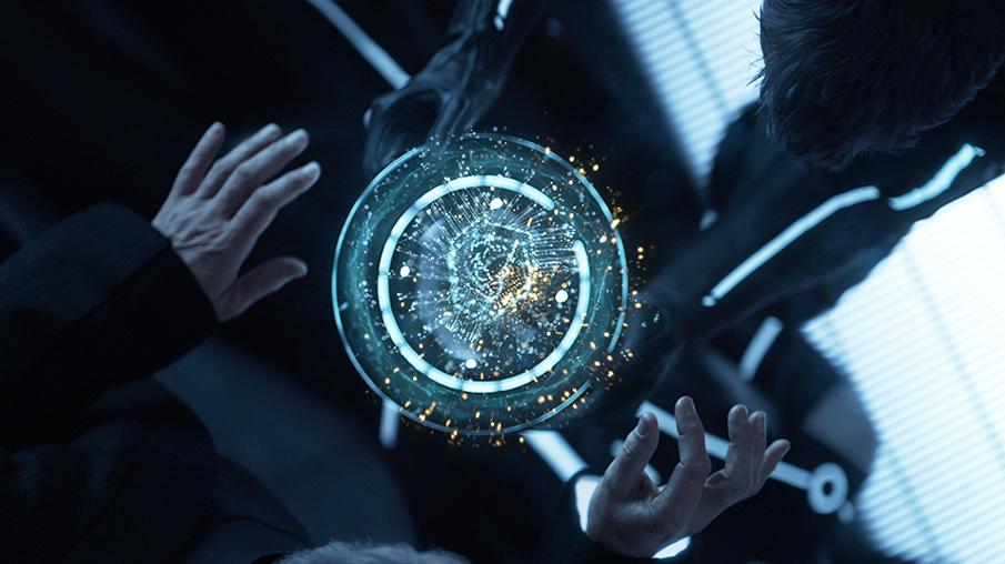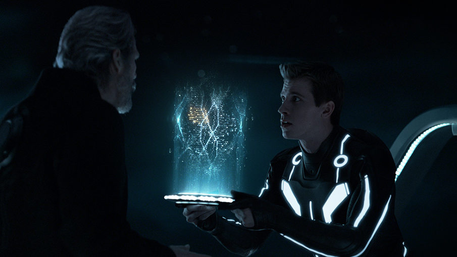 So Munkowitz and Jake Sargeant established a visual foundation, first designing a holographic representation of Flynn's identiftying boot-up hologram, which is then unlocked and dissipates bit by bit to initiate the data restructuring, which grows in complexity as each ensuing sector is filled with digital content.
