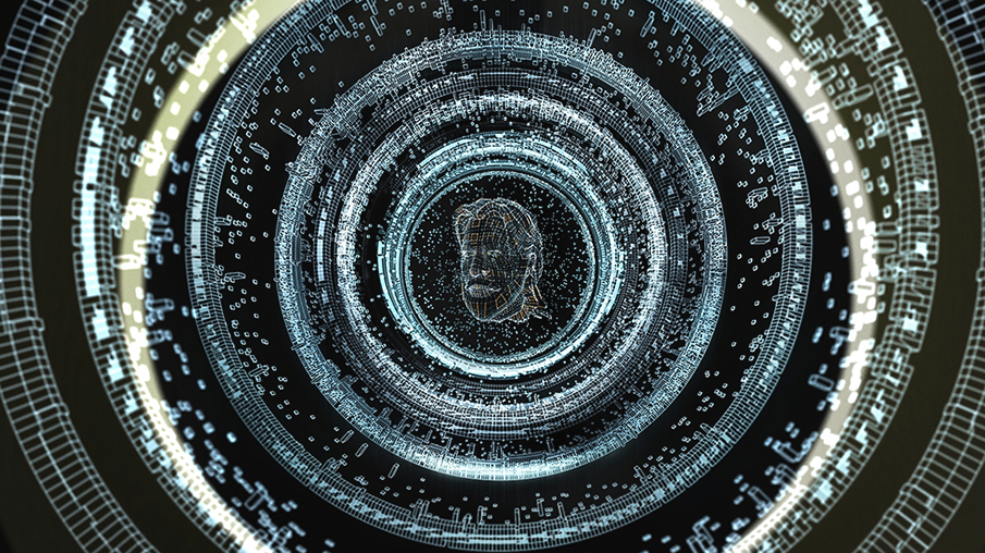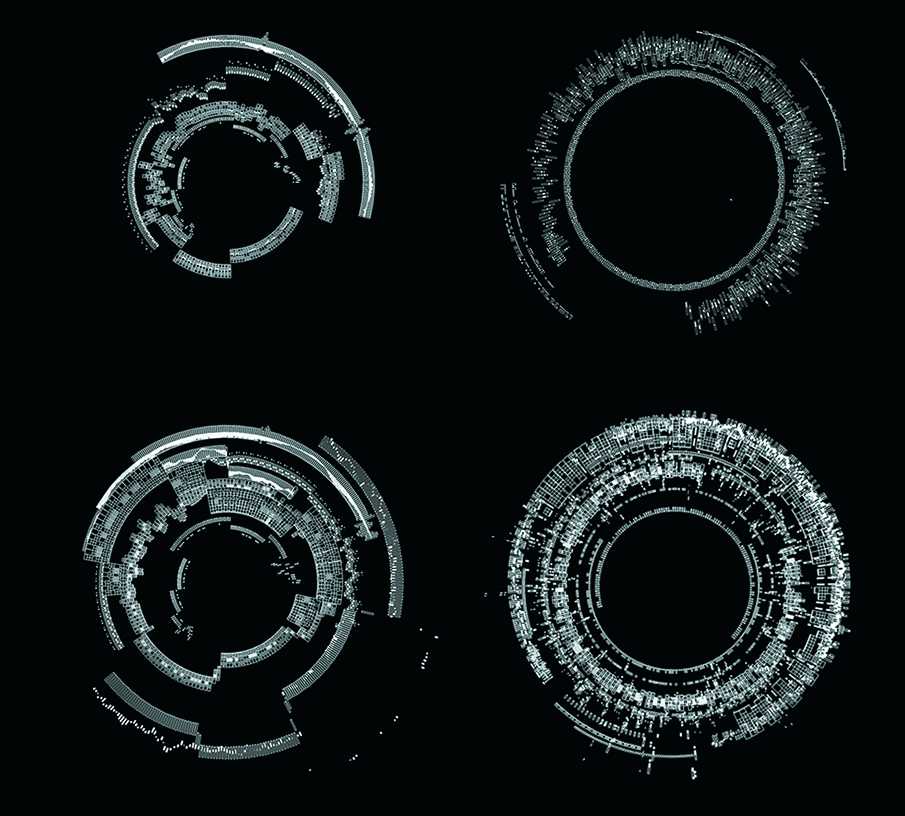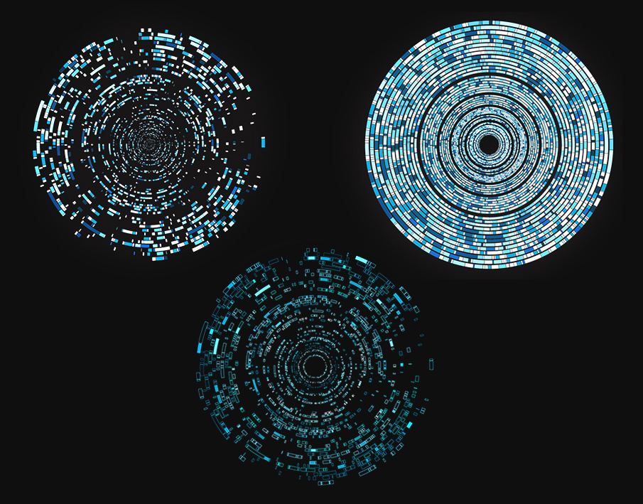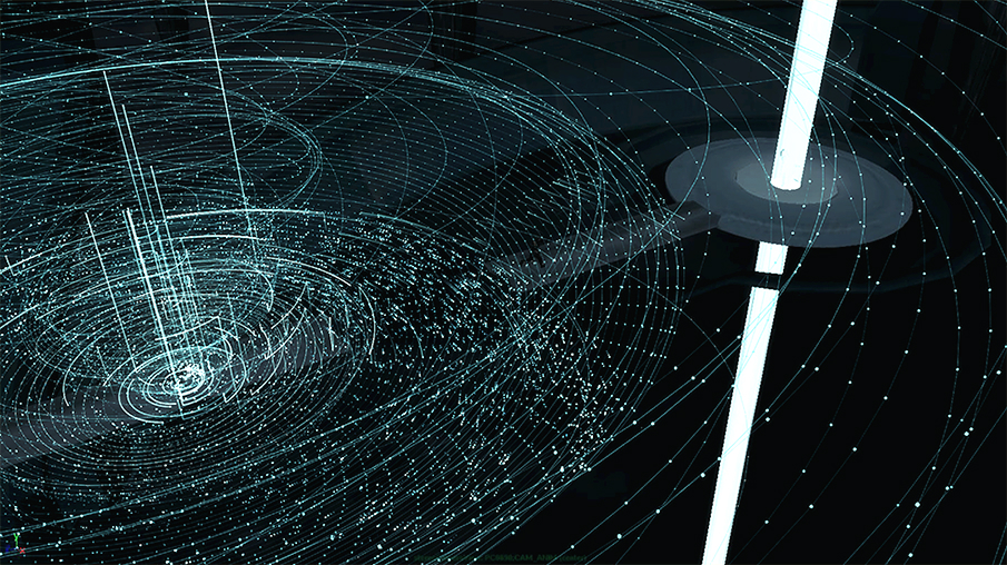 The team's task was to visually represent the immense amounts of information being extracted, first as a chaotic assemblage, then organizing the packets into concentric rings of decoded data as the camera gracefully pushes through them.