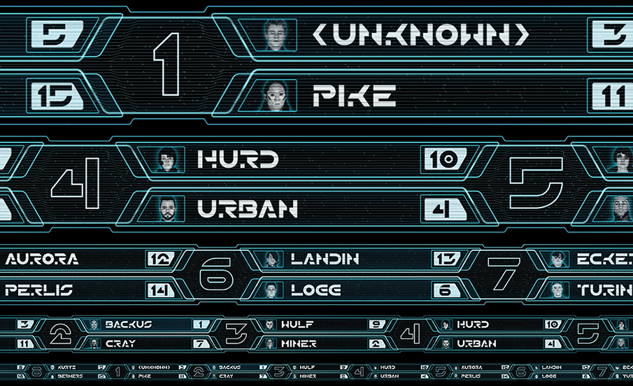 The scoreboard was broken down into 8 bracketed matches, displaying 16 combatants in total for round 01. The bracket design had to accommodate multiple rounds of game play, so it was designed with a collapsable behavior in mind. An external HUD display was also crafted to add detail and an extra layer of depth, as well as a concepted formation design generated from the light tracers below.